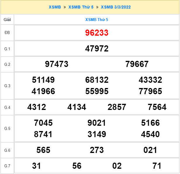 Các bạn có thể thử vận may tìm ra con số may mắn của mình bằng cách tham gia Quay thử XSMB. Bên dưới đây là bảng quay thử XSMB ngày 3/3/2022 mà chúng tôi đã thực hiện, mời bạn tham khảo: